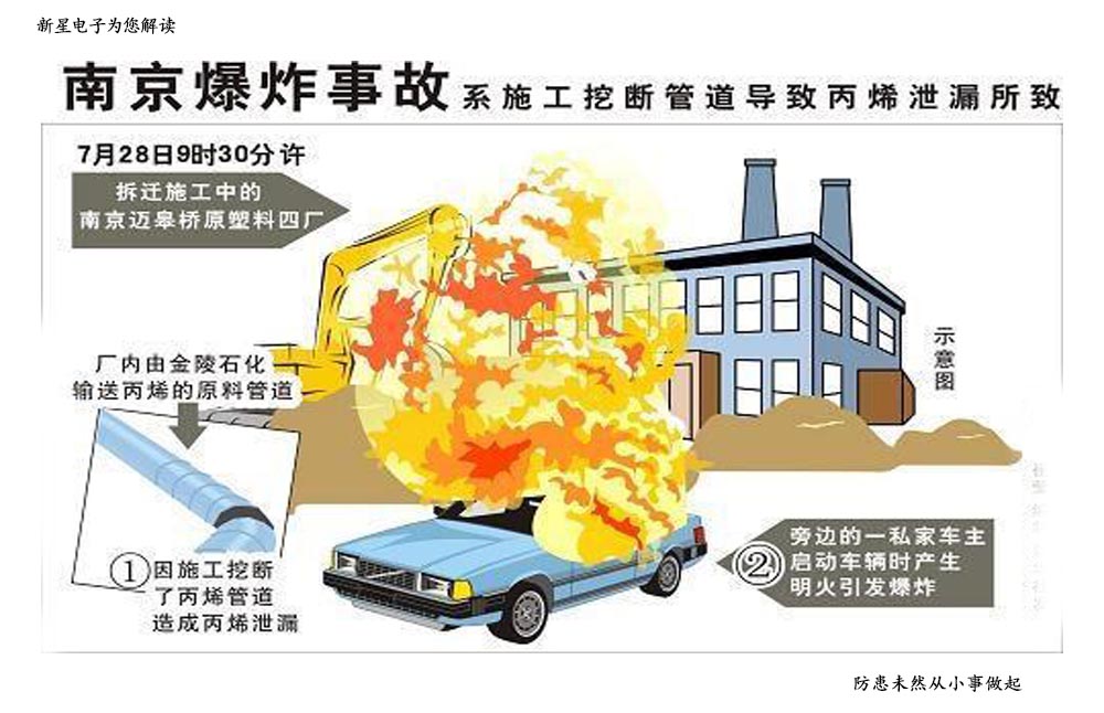 事故原因現已初步查明,施工人員在原南京塑料四廠廠區場地平整施工中,挖掘機械違規碰裂地下丙烯管線,造成丙烯泄漏,與空氣形成 爆炸性混合物,遇明火后發生爆燃。